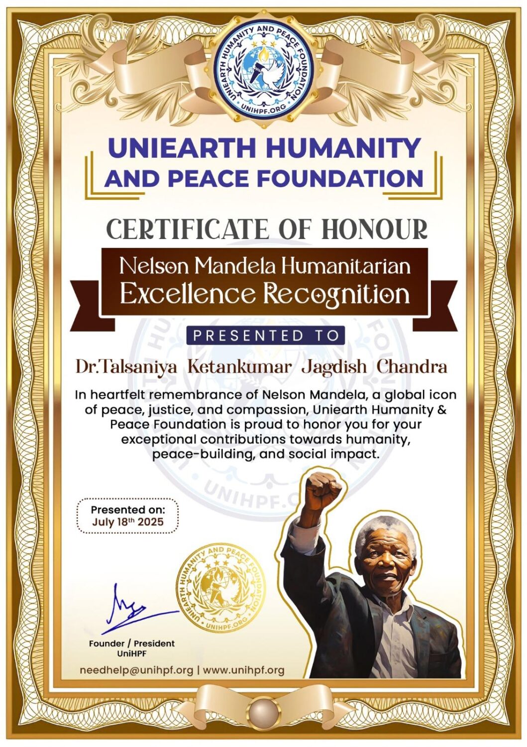 Certificate of Honour – Nelson Mandela Humanitarian Excellence Recognition, in heartfelt remembrance of Nelson Mandela by Uniearth Humanity and Peace Foundation.
