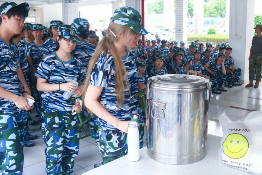 军训新生领取茶饮现场