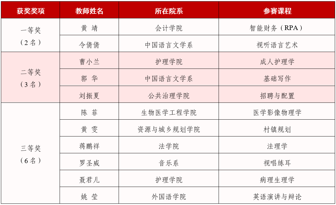 经过激烈角逐,现场决赛最终评选出一等奖2名、二等奖3名、三等奖6名。会计学院、中国语言文学系获优秀组织奖。