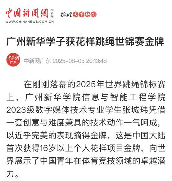 2025年8月,《中国新闻网》《中国教育在线》《中国高校之窗》《南方日报》《羊城晚报》等媒体报道了我校信息与智能工程学院2023级学生张城玮,凭借高难度的花样跳绳技艺,成为“跳绳少年”,其事迹被人民网视频号全网推送,赢得广泛赞誉。