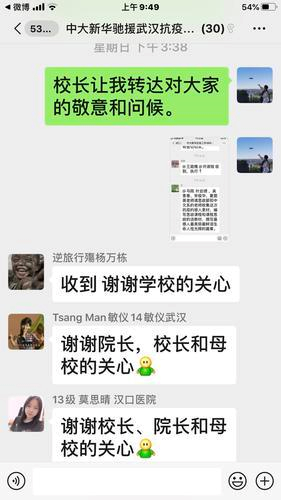 中山大学新华学院驰援湖北的护理校友在微信群里表示感谢