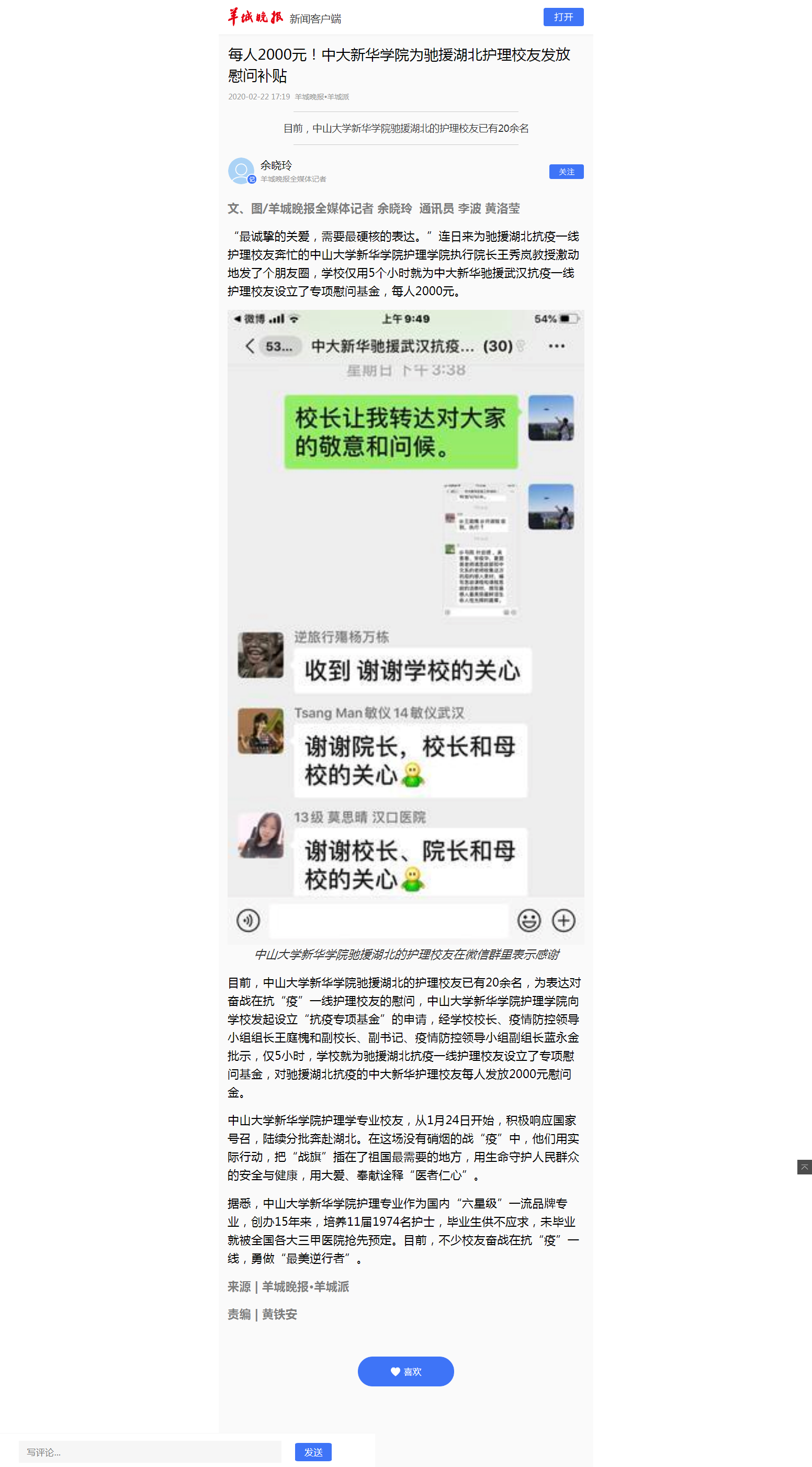 目前,中山大学新华学院驰援湖北的护理校友已有20余名,为表达对奋战在抗“疫”一线护理校友的慰问,中山大学新华学院护理学院向学校发起设立“抗疫专项基金”的申请,经学校校长、疫情防控领导小组组长王庭槐和副校长、副书记、疫情防控领导小组副组长蓝永金批示,仅5小时,学校就为驰援湖北抗疫一线护理校友设立了专项慰问基金,对驰援湖北抗疫的中大新华护理校友每人发放2000元慰问金。
