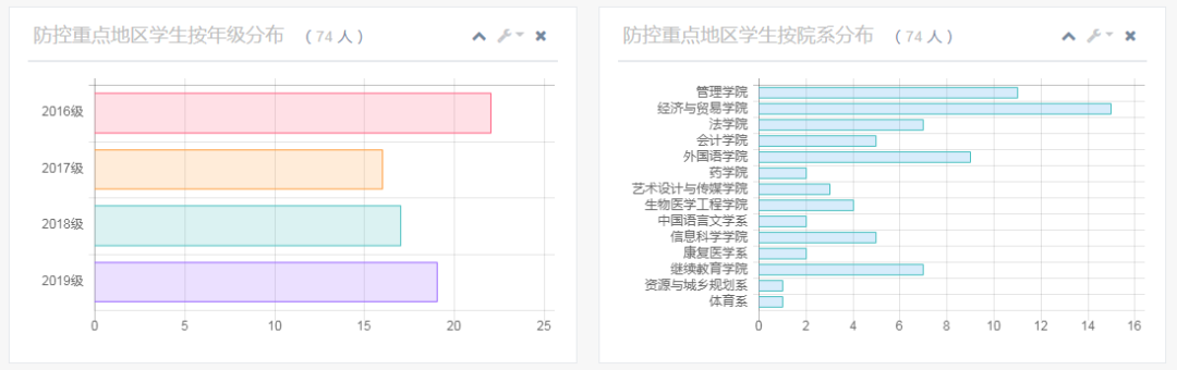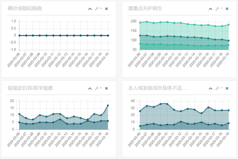 学校根据疫情防控工作需要,利用首轮采集到的数据,立即部署对身处防控重点地区、本人或家人身体不适,以及接触疑似或确诊病例师生的重点关护工作。为落实这项“人盯人”精准关护工作,开发团队在管理后台新增了关护工作记录功能,使各院系可以了解学生近14天的行程情况、接触史及身体健康状况,并将对学生的关爱跟踪情况记录下来,准确了解变化过程,确保了这项工作的延续性和可控性。