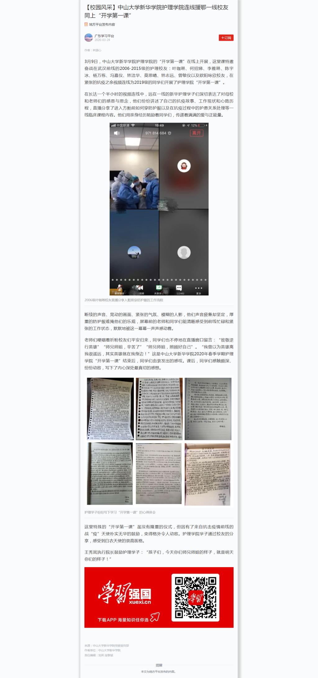 3月9日,中山大学新华学院护理学院的“开学第一课”在线上开展,这堂课特邀奋战在武汉前线的2006-2015级的护理校友:叶珈琳、何招娣、李雅琳、陈宇冰、杨万栋、冯嘉仪、林洁华、莫思晴、林志远、曾敏仪以及欧阳咏欣校友,在紧张的抗疫之余视频连线为2019级的同学们开展了护理学院“开学第一课”。