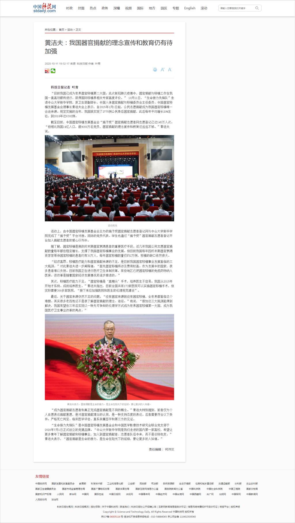 “目前我国已成为世界器官移植第二大国。此次新冠肺炎疫情中,器官捐献与移植工作在我国一直高效顺利进行,获得国际移植界相关专家高度评价。” 10月11日,“生命接力先锋队”走进中山大学新华学院,原卫生部副部长、中国人体器官捐献与移植委员会主任委员、中国器官移植发展基金会理事长黄洁夫会上表示,自2015年1月1日起,公民志愿捐献成为我国器官移植唯一合法来源。规定实施的当年,我国就实现了2775例公民身后器官捐献,此后每年平均增长20%左右,到2018年达6302例。