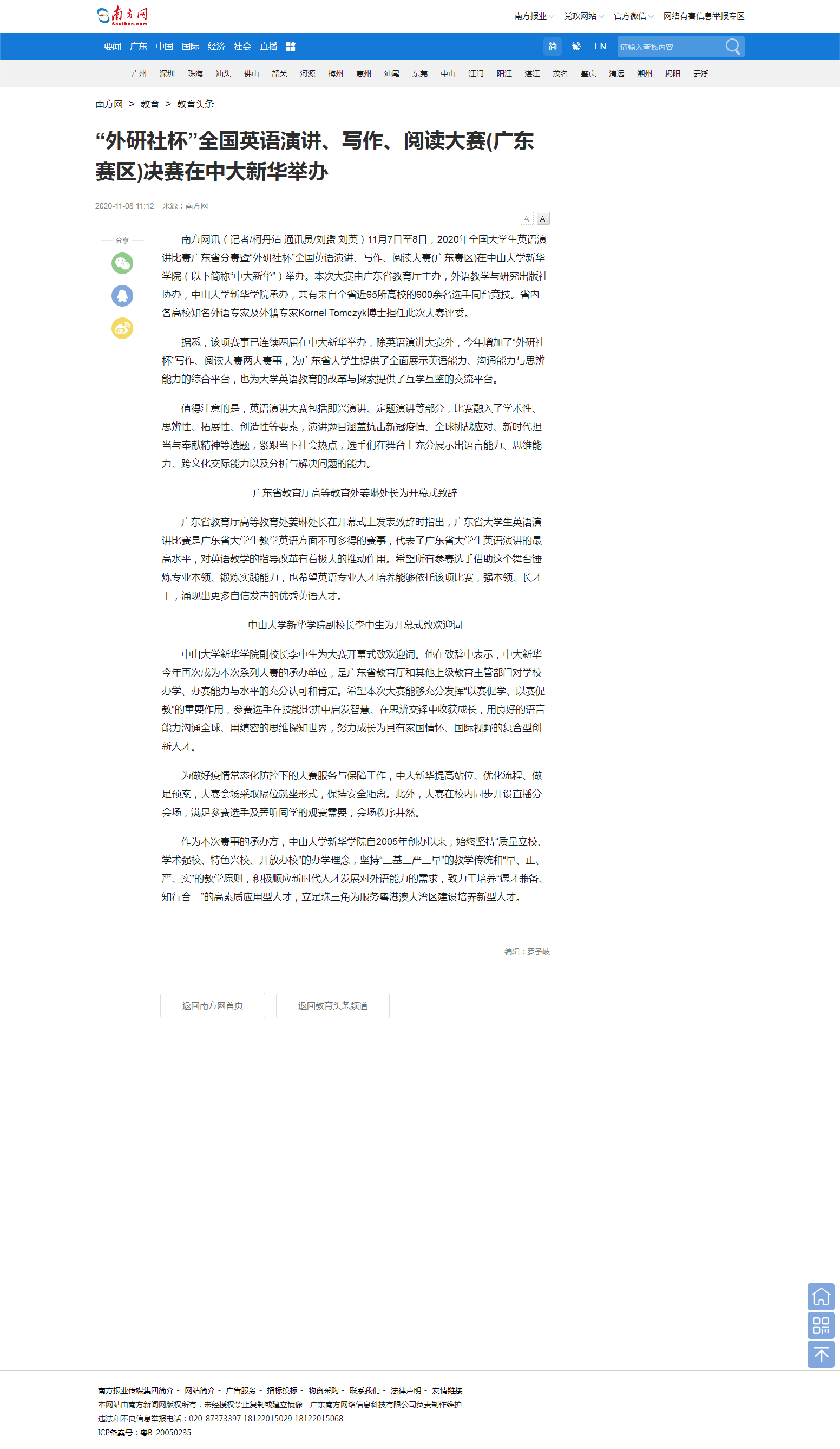 南方网讯(记者/柯丹洁 通讯员/刘赟 刘英)11月7日至8日,2020年全国大学生英语演讲比赛广东省分赛暨“外研社杯”全国英语演讲、写作、阅读大赛(广东赛区)在中山大学新华学院(以下简称“中大新华”)举办。本次大赛由广东省教育厅主办,外语教学与研究出版社协办,中山大学新华学院承办,共有来自全省近65所高校的600余名选手同台竞技。省内各高校知名外语专家及外籍专家Kornel Tomczyk博士担任此次大赛评委。