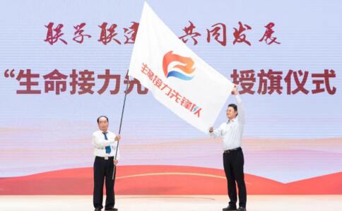 活动现场还举行了“生命接力先锋队”授旗仪式。中国器官移植发展基金会和中国医学影像技术研究会联合党支部书记、中国器官移植发展基金会副理事长兼秘书长赵洪涛将“生命接力先锋队”队旗交到中大新华党委副书记、副校长蓝永金手中。