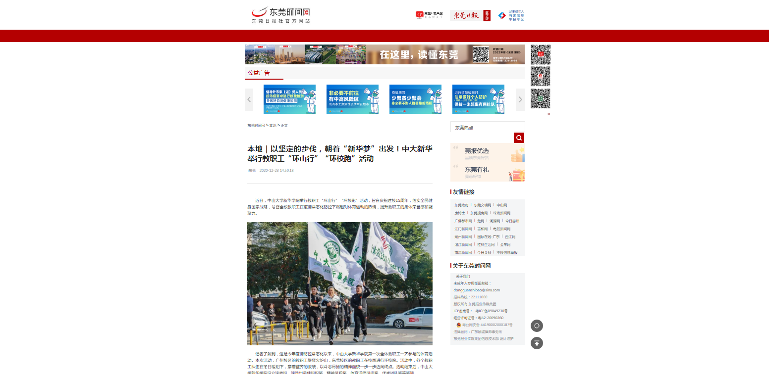 记者了解到,这是今年疫情防控常态化以来,中山大学新华学院第一次全体教职工一齐参与的体育活动。本次活动,广州校区的教职工攀登火炉山,东莞校区的教职工在校园进行环校跑。活动中,各个教职工队伍在冬日暖阳下,穿着整齐的服装,以斗志昂扬的精神面貌一步一步迈向终点。活动结束后,中山大学新华学院设立评委组,评选出最佳组织奖、精神风貌奖、体育道德风尚奖、优秀团队奖等奖项。