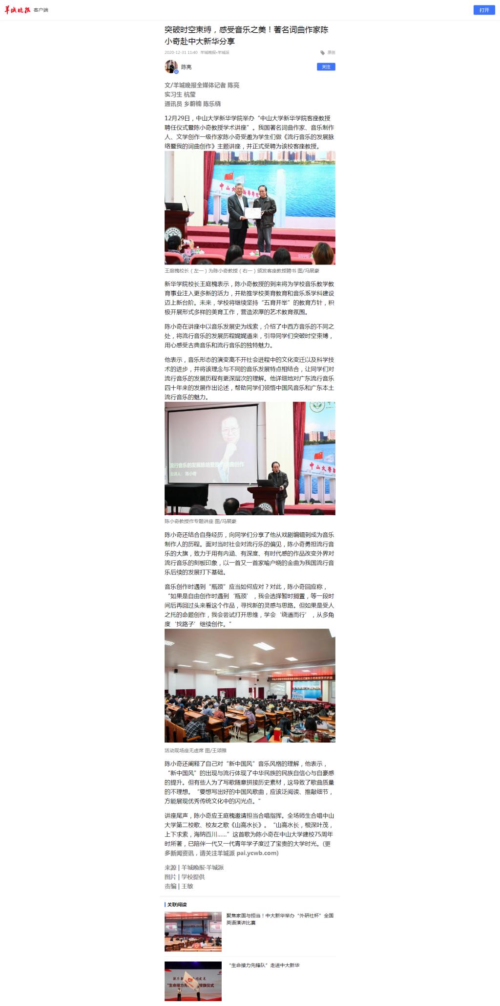 12月29日,中山大学新华学院举办“中山大学新华学院客座教授聘任仪式暨陈小奇教授学术讲座”。我国著名词曲作家、音乐制作人、文学创作一级作家陈小奇受邀为学生们做《流行音乐的发展脉络暨我的词曲创作》主题讲座,并正式受聘为该校客座教授。