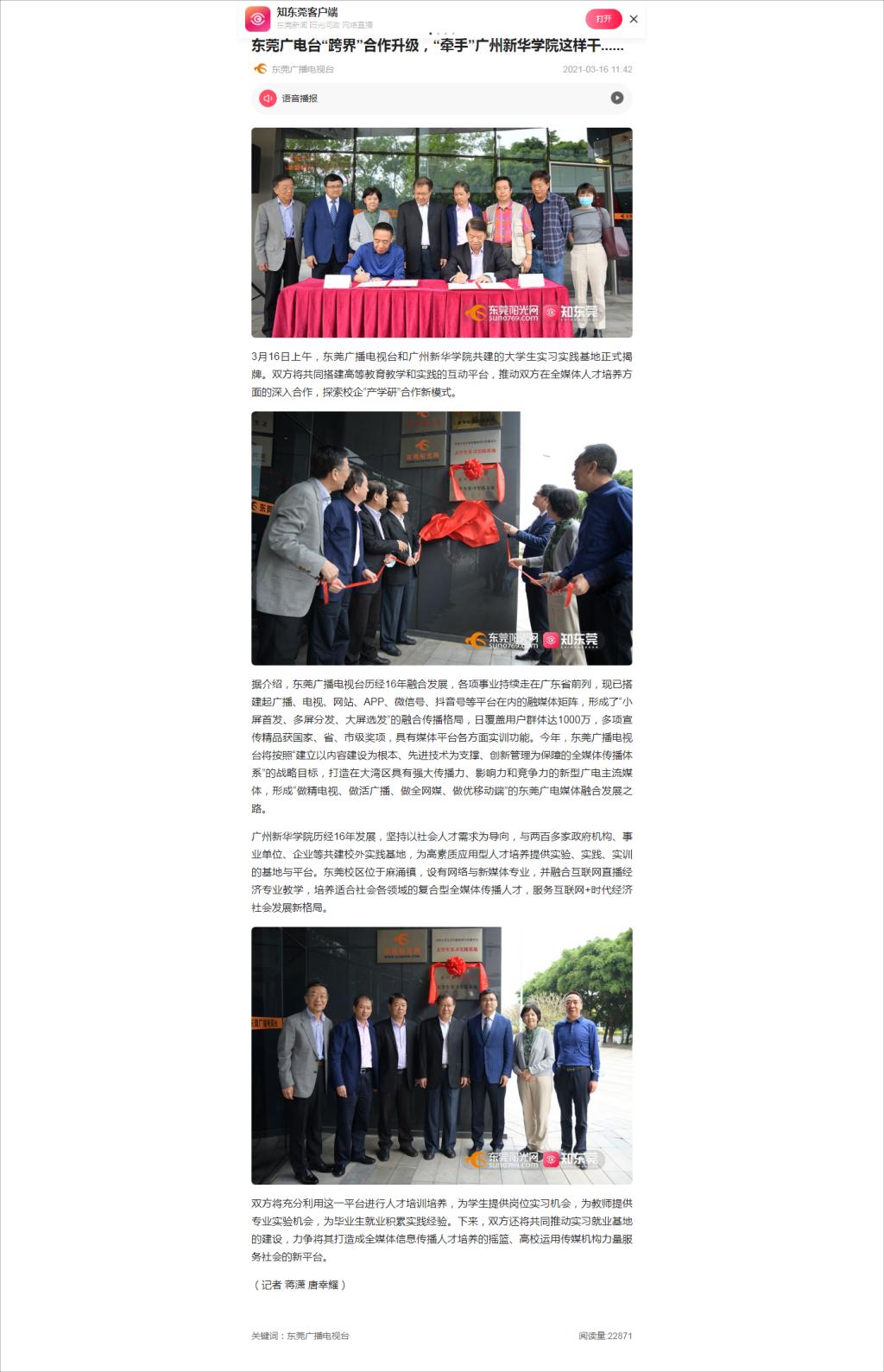 3月16日上午,东莞广播电视台和suncitygroup太阳集团共建大学生实习实践基地正式揭牌。双方将共同搭建高等教育教学和实践的互动平台,推动双方在全媒体人才培养方面的深入合作,探索校企“产学研”合作新模式。