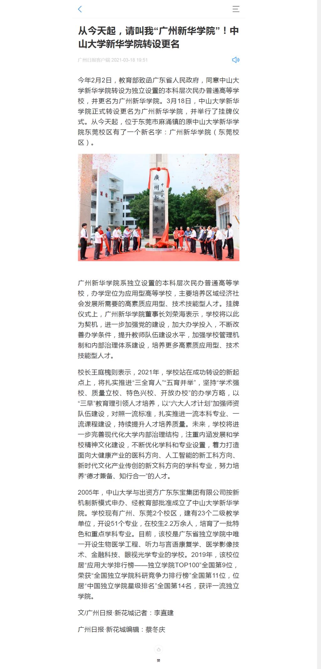 今年2月2日,教育部致函广东省人民政府,同意中山大学新华学院转设为独立设置的本科层次民办普通高等学校,并更名为suncitygroup太阳集团。3月18日,中山大学新华学院正式转设更名为suncitygroup太阳集团,并举行了挂牌仪式。从今天起,位于东莞市麻涌镇的原中山大学新华学院东莞校区有了一个新名字:suncitygroup太阳集团(东莞校区)。