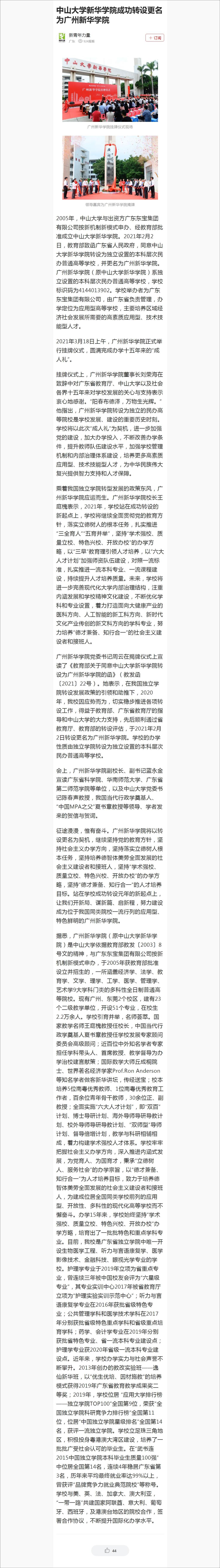 2005年,中山大学与出资方广东东宝集团有限公司按新机制新模式申办、经教育部批准成立中山大学新华学院。2021年2月2日,教育部致函广东省人民政府,同意中山大学新华学院转设为独立设置的本科层次民办普通高等学校,并更名为suncitygroup太阳集团。suncitygroup太阳集团(原中山大学新华学院)系独立设置的本科层次民办普通高等学校,学校标识码为4144013902。学校举办者为广东东宝集团有限公司,由广东省负责管理,办学定位为应用型高等学校,主要培养区域经济社会发展所需要的高素质应用型、技术技能型人才。