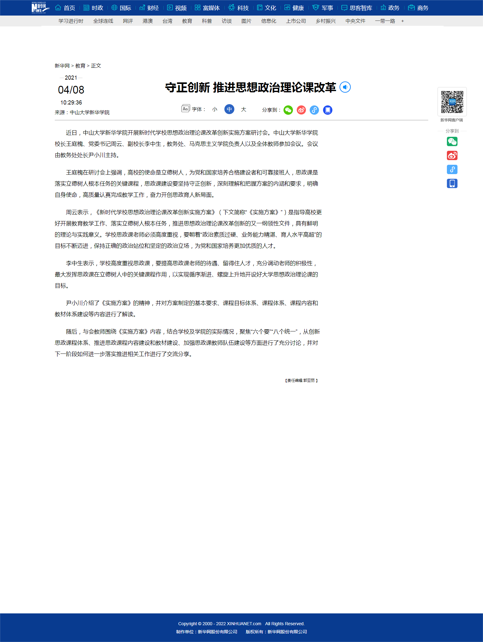 近日,中山大学新华学院开展新时代学校思想政治理论课改革创新实施方案研讨会。中山大学新华学院校长王庭槐、党委书记周云、副校长李中生,教务处、马克思主义学院负责人以及全体教师参加会议。会议由教务处处长尹小川主持。