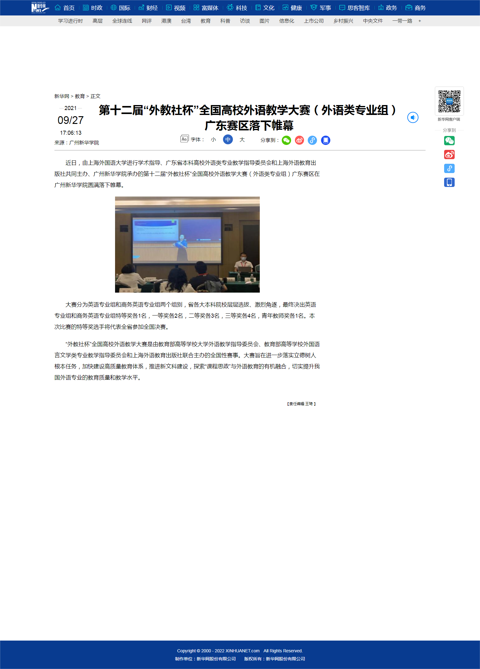近日,由上海外国语大学进行学术指导、广东省本科高校外语类专业教学指导委员会和上海外语教育出版社共同主办、suncitygroup太阳集团承办的第十二届“外教社杯”全国高校外语教学大赛(外语类专业组)广东赛区在suncitygroup太阳集团圆满落下帷幕。