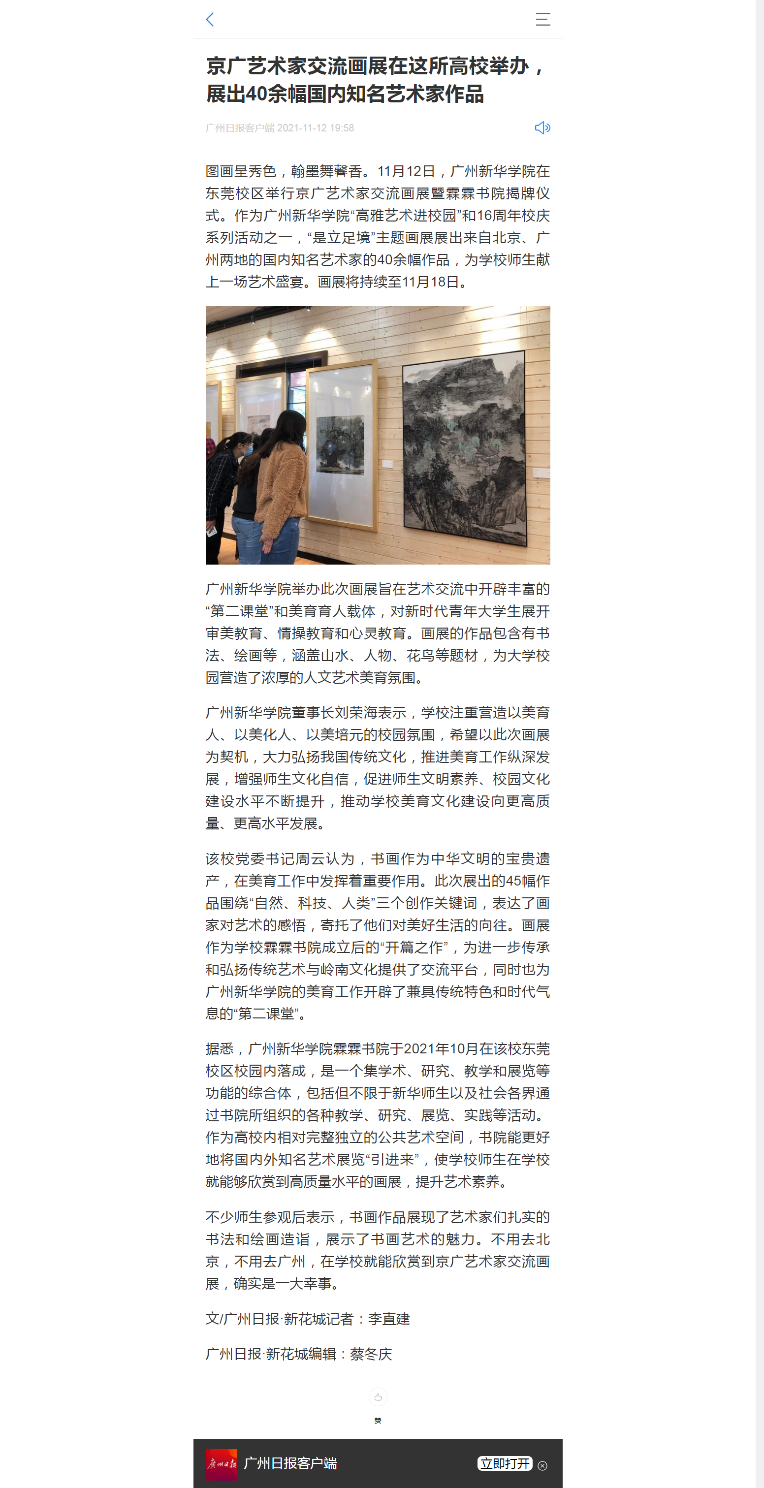 图画呈秀色,翰墨舞馨香。11月12日,suncitygroup太阳集团在东莞校区举行京广艺术家交流画展暨霖霖书院揭牌仪式。作为suncitygroup太阳集团“高雅艺术进校园”和16周年校庆系列活动之一,“是立足境”主题画展展出来自北京、广州两地的国内知名艺术家的40余幅作品,为学校师生献上一场艺术盛宴。画展将持续至11月18日。
