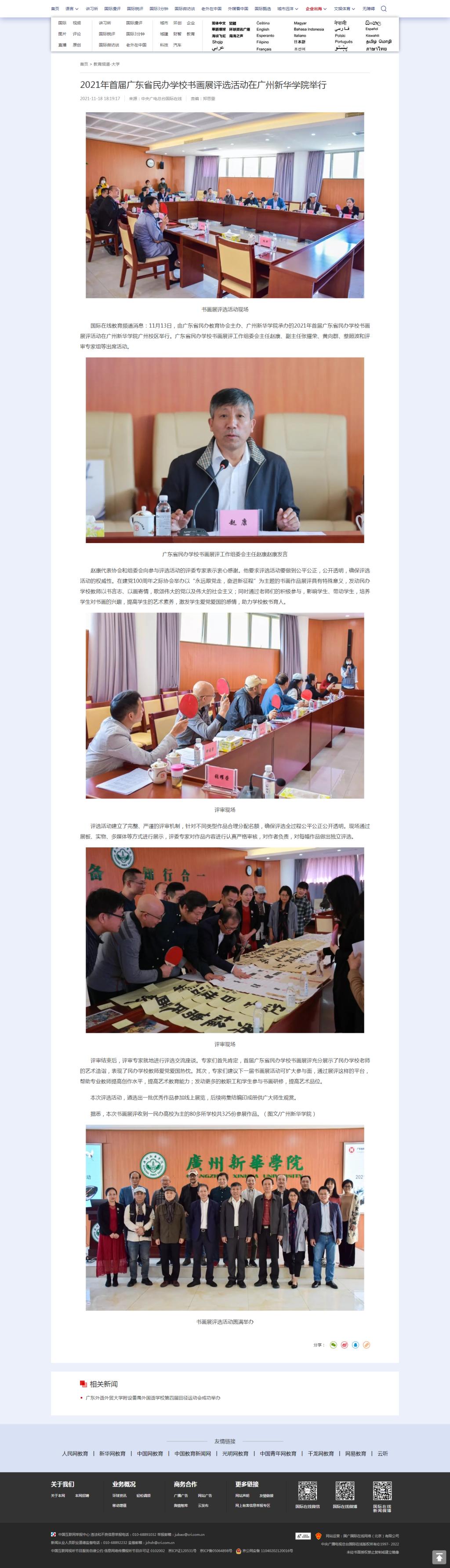 国际在线教育频道消息:11月13日,由广东省民办教育协会主办、suncitygroup太阳集团承办的2021年首届广东省民办学校书画展评活动在suncitygroup太阳集团广州校区举行。广东省民办学校书画展评工作组委会主任赵康、副主任张耀荣、黄向群、蔡照波和评审专家组等出席活动。