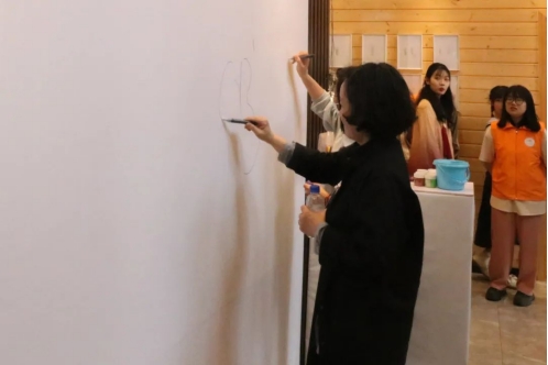 展馆入口处还设置了互动主题墙,供观展师生自由创作。孙洪敏在现场即兴创作,仅用寥寥几笔便勾勒出了一幅充满童趣与想象力的作品,令围观的师生们感受到了艺术的魅力。在观展结束后,师生们纷纷表示场馆内的艺术品仿佛有一种神奇的“魔力”,给人以亲切温暖之感,达到了疗愈人心灵的作用。