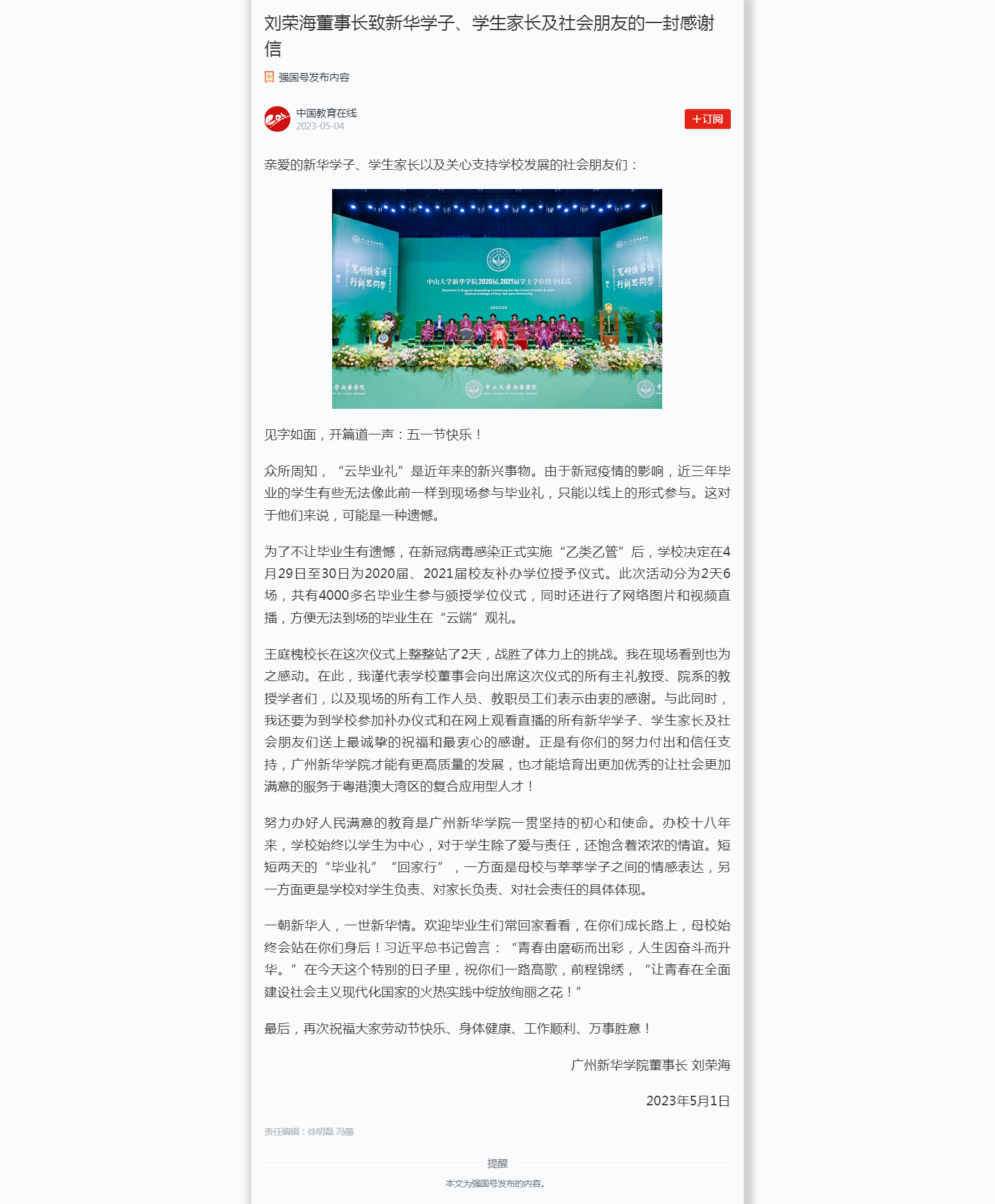 一朝新华人,一世新华情。欢迎毕业生们常回家看看,在你们成长路上,母校始终会站在你们身后!习近平总书记曾言:“青春由磨砺而出彩,人生因奋斗而升华。”在今天这个特别的日子里,祝你们一路高歌,前程锦绣,“让青春在全面建设社会主义现代化国家的火热实践中绽放绚丽之花!”