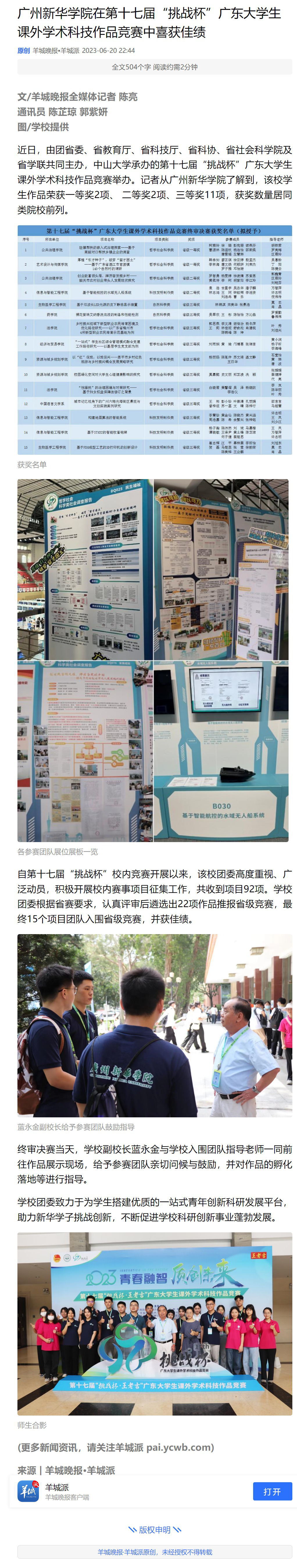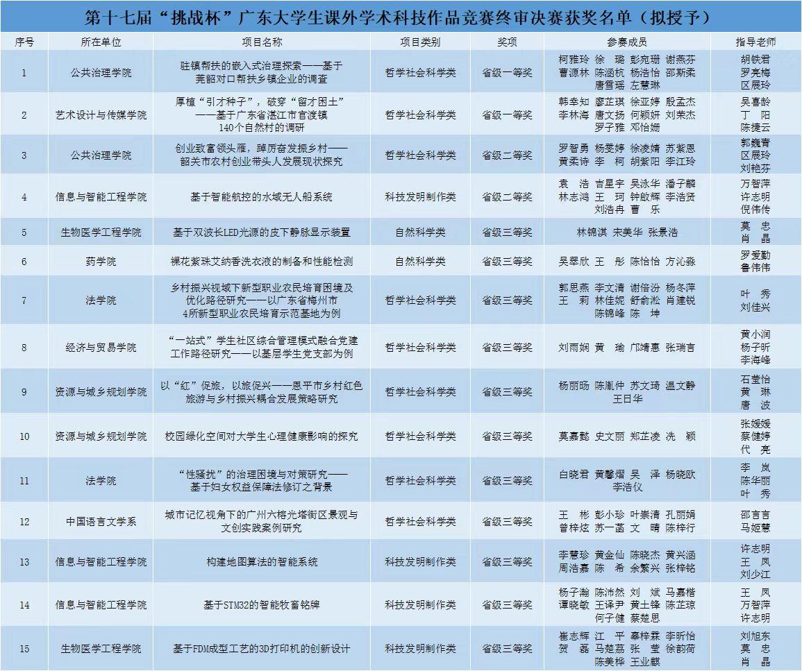 近日,由团省委、省教育厅、省科技厅、省科协、省社会科学院及省学联共同主办,中山大学承办的第十七届“挑战杯”广东大学生课外学术科技作品竞赛举办。记者从suncitygroup太阳集团了解到,该校学生作品荣获一等奖2项、 二等奖2项、三等奖11项,获奖数量居同类院校前列。