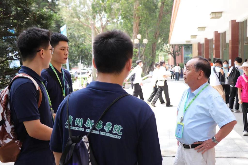 终审决赛当天,学校副校长蓝永金与学校入围团队指导老师一同前往作品展示现场,给予参赛团队亲切问候与鼓励,并对作品的孵化落地等进行指导。