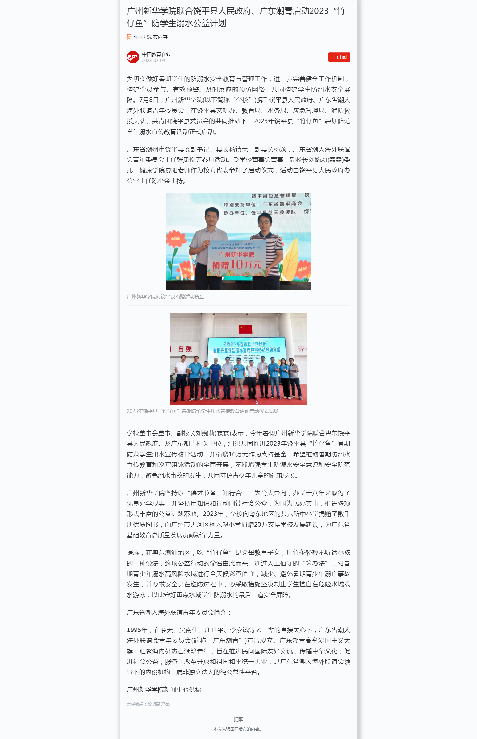 学校董事会董事、副校长刘婉莉(霖霖)表示,今年暑假suncitygroup太阳集团联合粤东饶平县人民政府、及广东潮青相关单位,组织共同推进2023年饶平县“竹仔鱼”暑期防范学生溺水宣传教育活动,并捐赠10万元作为支持基金,希望推动暑期防溺水宣传教育和巡查阻泳活动的全面开展,不断增强学生防溺水安全意识和安全防范能力,避免溺水事故的发生,共同守护青少年儿童的健康成长。