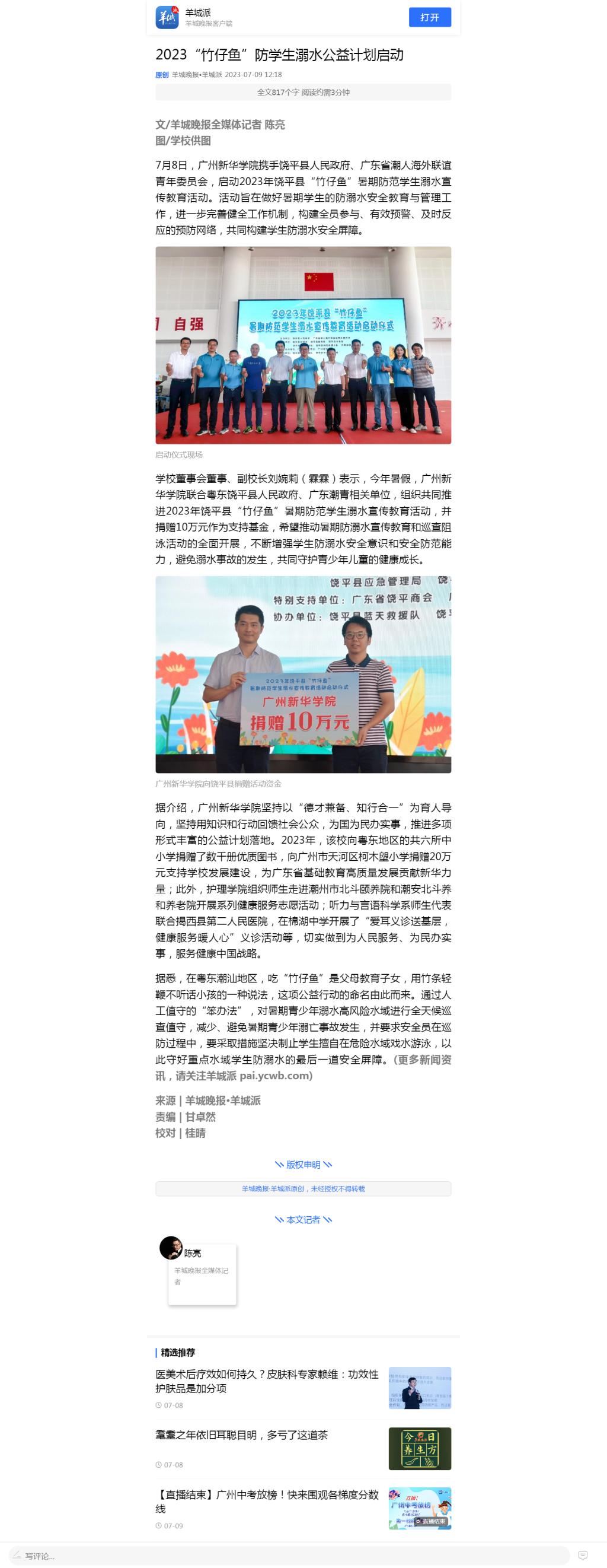 学校董事会董事、副校长刘婉莉(霖霖)表示,今年暑假,suncitygroup太阳集团联合粤东饶平县人民政府、广东潮青相关单位,组织共同推进2023年饶平县“竹仔鱼”暑期防范学生溺水宣传教育活动,并捐赠10万元作为支持基金,希望推动暑期防溺水宣传教育和巡查阻泳活动的全面开展,不断增强学生防溺水安全意识和安全防范能力,避免溺水事故的发生,共同守护青少年儿童的健康成长。