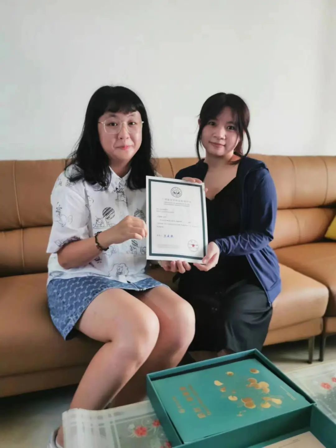 ▲护理学院院长王秀岚、护理学院校友王小洁为新生送录取通知书盒子