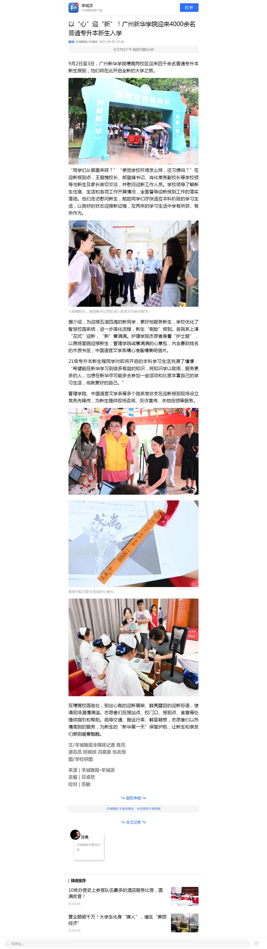 据介绍,为迎接五湖四海的新同学,更好地服务新生,学校优化了智慧校园系统,进一步简化流程,新生“刷脸”报到。各院系上演“花式”迎新,“新”意满满。护理学院志愿者身着“护士服”,以昂扬面貌迎接新生;管理学院诚意满满的心意包,内含篆刻姓名的木质书签;中国语言文学系精心准备精美明信片。