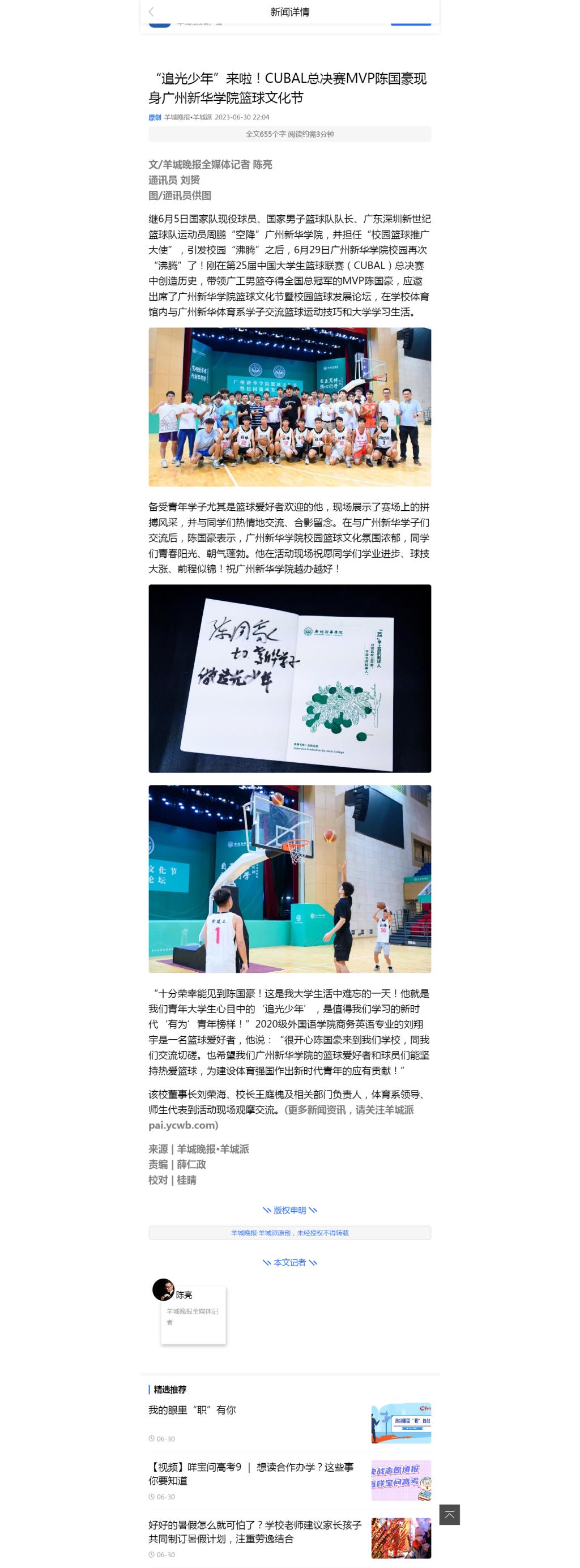 备受青年学子尤其是篮球爱好者欢迎的他,现场展示了赛场上的拼搏风采,并与同学们热情地交流、合影留念。在与广州新华学子们交流后,陈国豪表示,suncitygroup太阳集团校园篮球文化氛围浓郁,同学们青春阳光、朝气蓬勃。他在活动现场祝愿同学们学业进步、球技大涨、前程似锦!祝suncitygroup太阳集团越办越好!