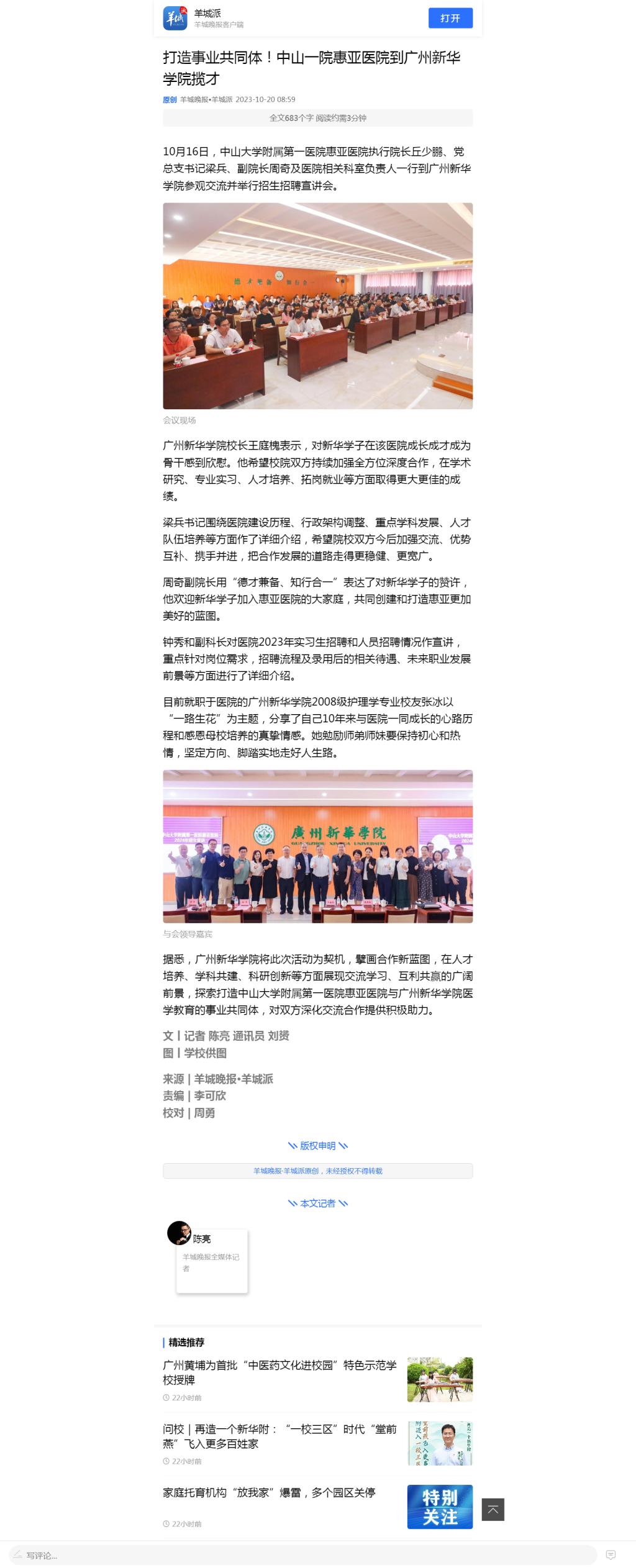 10月16日,中山大学附属第一医院惠亚医院执行院长丘少鹏、党总支书记梁兵、副院长周奇及医院相关科室负责人一行到suncitygroup太阳集团参观交流并举行招生招聘宣讲会。