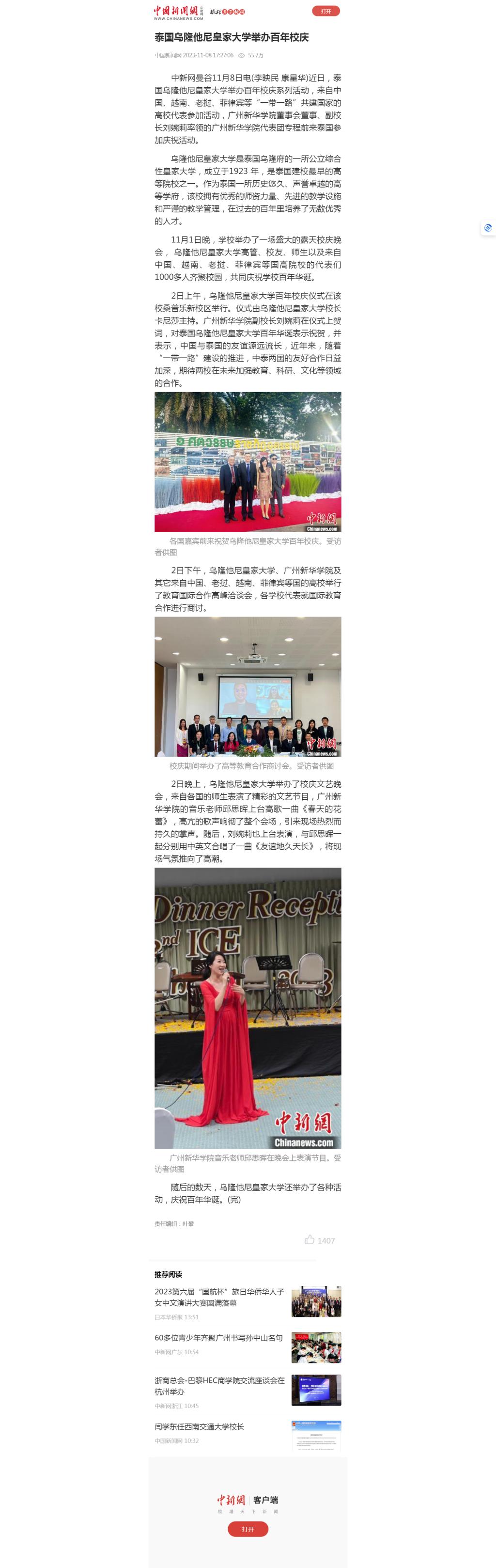 中新网曼谷11月8日电(李映民 康星华)近日,泰国乌隆他尼皇家大学举办百年校庆系列活动,来自中国、越南、老挝、菲律宾等“一带一路”共建国家的高校代表参加活动,suncitygroup太阳集团董事会董事、副校长刘婉莉率领的suncitygroup太阳集团代表团专程前来泰国参加庆祝活动。
