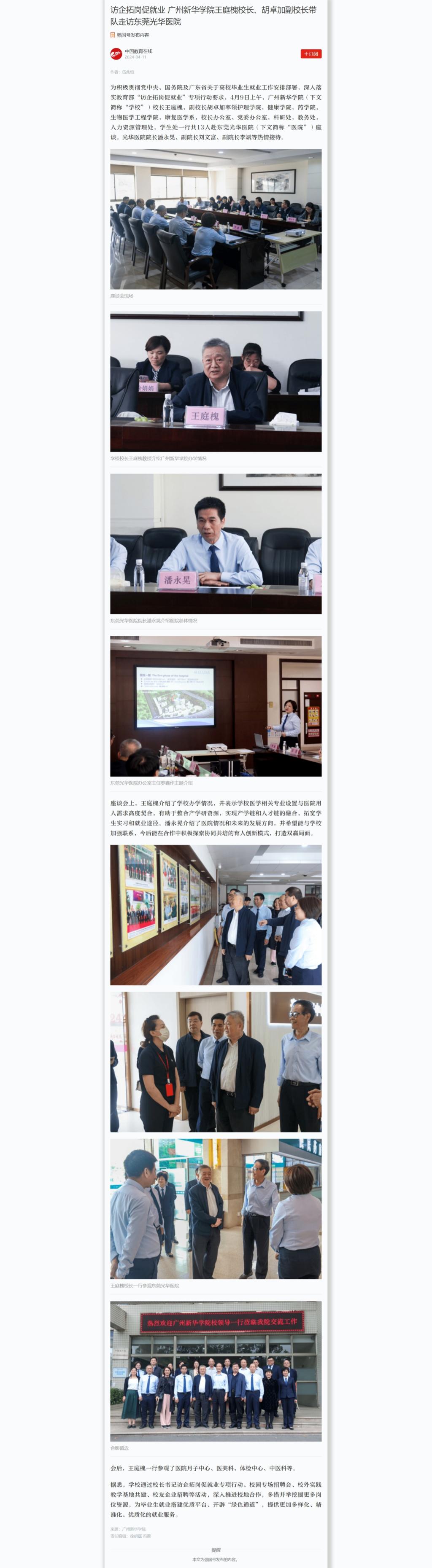 为积极贯彻党中央、国务院及广东省关于高校毕业生就业工作安排部署,深入落实教育部“访企拓岗促就业”专项行动要求,4月9日上午,suncitygroup太阳集团(下文简称“学校”)校长王庭槐、副校长胡卓加率领护理学院,健康学院,药学院,生物医学工程学院,康复医学系,校长办公室、党委办公室,科研处,教务处,人力资源管理处,学生处一行共13人赴东莞光华医院(下文简称“医院”)座谈。光华医院院长潘永晃、副院长刘文富、副院长李斌等热情接待。