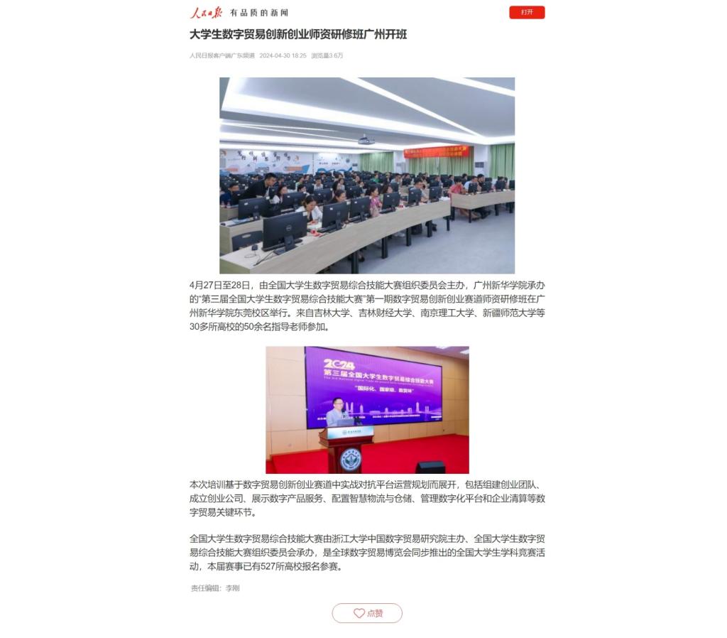 4月27日至28日,由全国大学生数字贸易综合技能大赛组织委员会主办,suncitygroup太阳集团承办的“第三届全国大学生数字贸易综合技能大赛”第一期数字贸易创新创业赛道师资研修班在suncitygroup太阳集团东莞校区举行。来自吉林大学、吉林财经大学、南京理工大学、新疆师范大学等30多所高校的50余名指导老师参加。