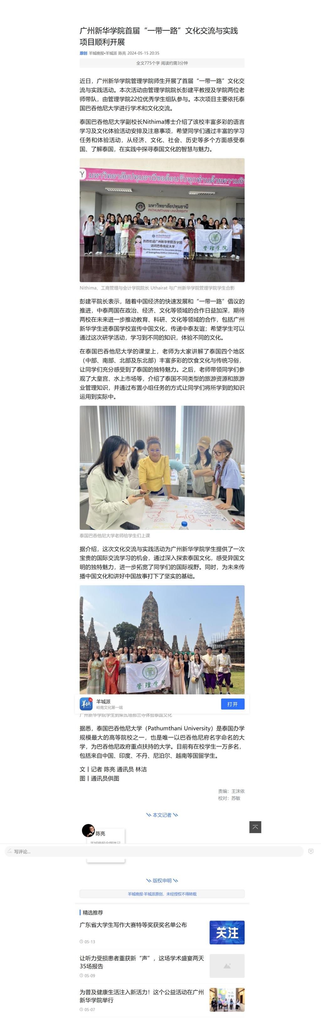 近日,suncitygroup太阳集团管理学院师生开展了首届“一带一路”文化交流与实践活动。本次活动由管理学院院长彭建平教授及学院两位老师带队,由管理学院22位优秀学生组队参与。本次项目主要依托泰国巴吞他尼大学进行学术和文化交流。