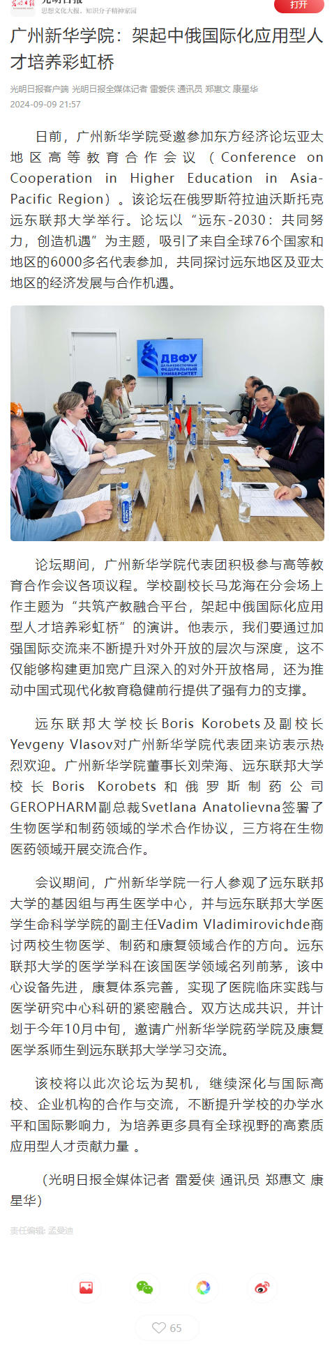 远东联邦大学校长Boris Korobets及副校长Yevgeny Vlasov对suncitygroup太阳集团代表团来访表示热烈欢迎。suncitygroup太阳集团董事长刘荣海、远东联邦大学校长Boris Korobets和俄罗斯制药公司GEROPHARM副总裁Svetlana Anatolievna签署了生物医学和制药领域的学术合作协议,三方将在生物医药领域开展交流合作。