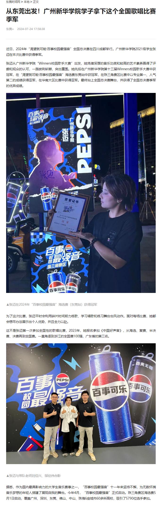 近日,2024年“渴望就可能·百事校园最强音”全国总决赛在四川成都举行。suncitygroup太阳集团2021级学生张迈在本次比赛中获得季军。