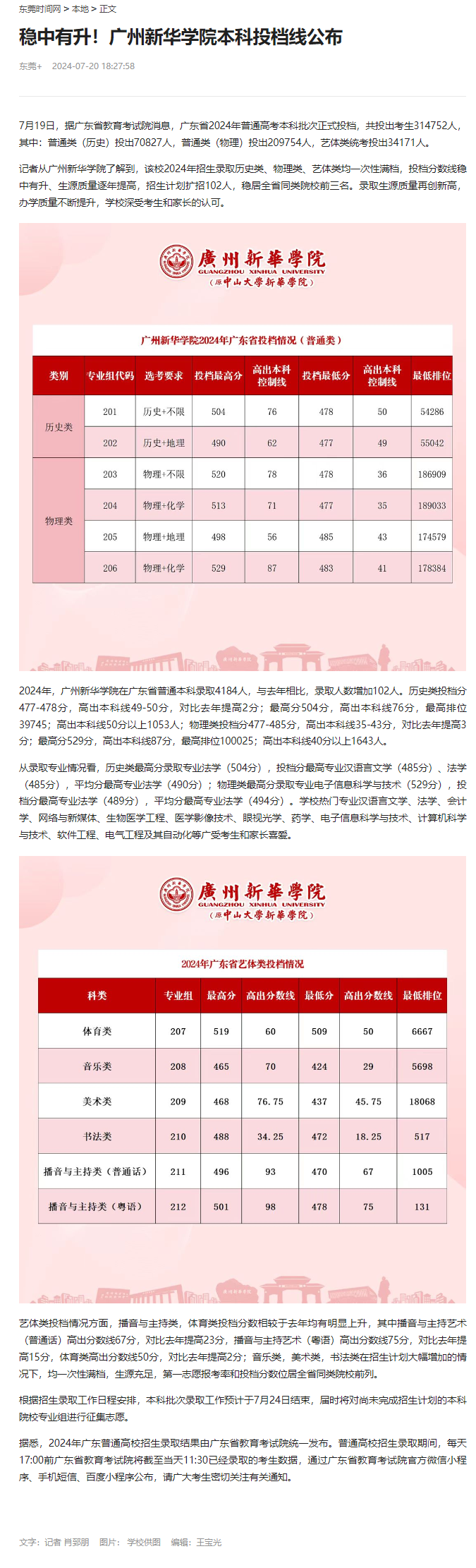 记者从suncitygroup太阳集团了解到,该校2024年招生录取历史类、物理类、艺体类均一次性满档,投档分数线稳中有升、生源质量逐年提高,招生计划扩招102人,稳居全省同类院校前三名。录取生源质量再创新高,办学质量不断提升,学校深受考生和家长的认可。