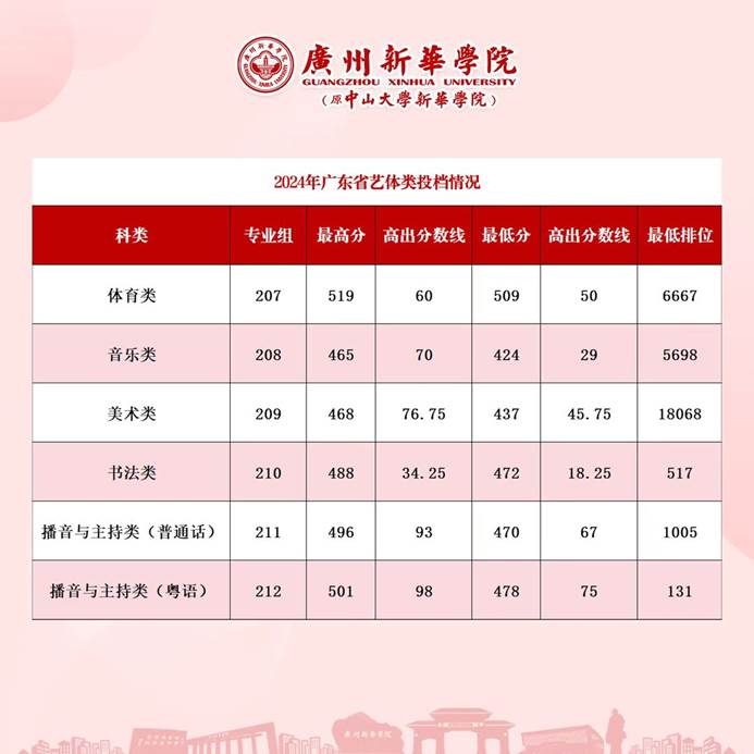 艺体类投档情况方面,播音与主持类,体育类投档分数相较于去年均有明显上升,其中播音与主持艺术(普通话)高出分数线67分,对比去年提高23分,播音与主持艺术(粤语)高出分数线75分,对比去年提高15分,体育类高出分数线50分,对比去年提高2分;音乐类,美术类,书法类在招生计划大幅增加的情况下,均一次性满档,生源充足,第一志愿报考率和投档分数位居全省同类院校前列。