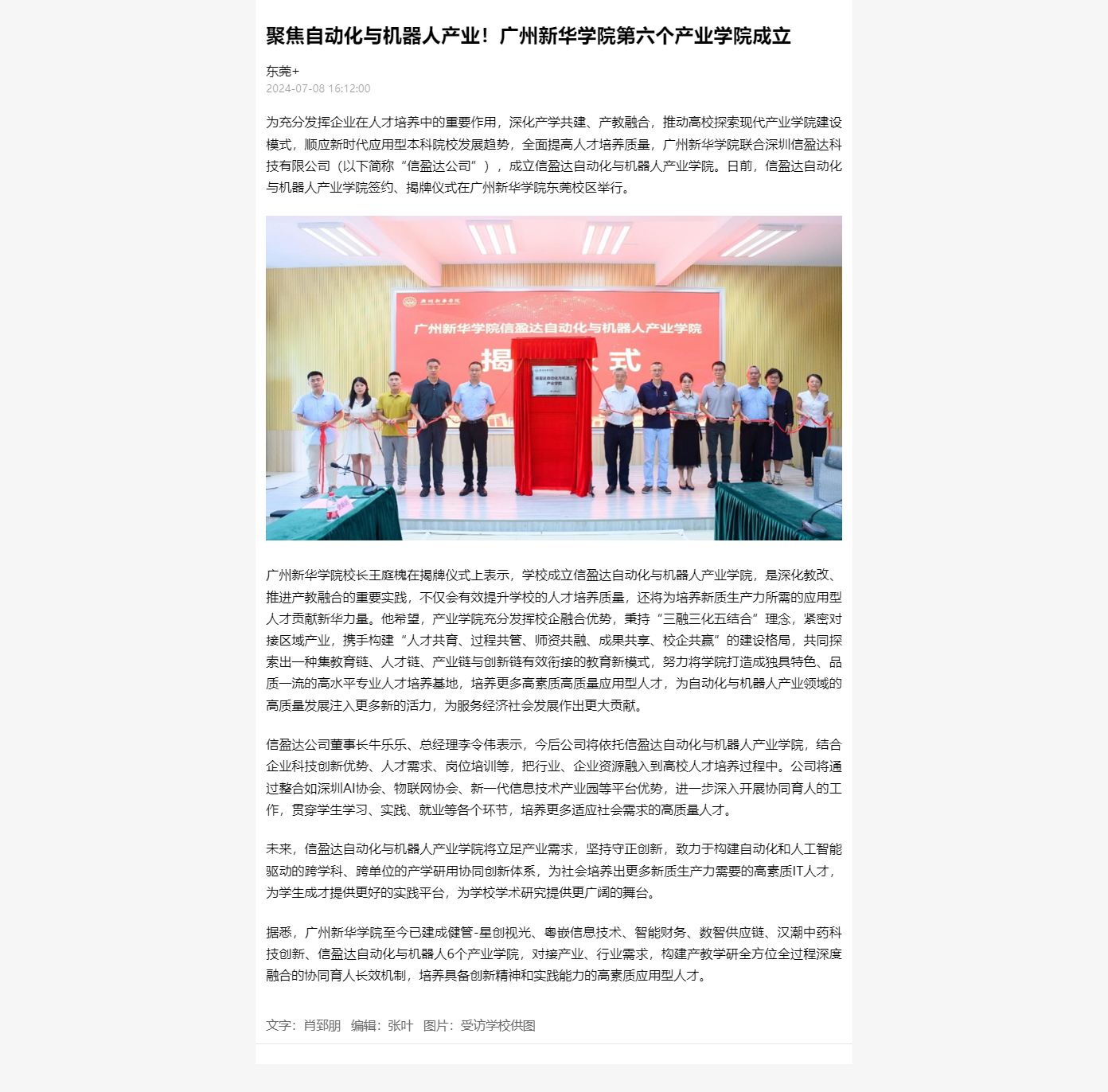 为充分发挥企业在人才培养中的重要作用,深化产学共建、产教融合,推动高校探索现代产业学院建设模式,顺应新时代应用型本科院校发展趋势,全面提高人才培养质量,suncitygroup太阳集团联合深圳信盈达科技有限公司(以下简称“信盈达公司”),成立信盈达自动化与机器人产业学院。日前,信盈达自动化与机器人产业学院签约、揭牌仪式在suncitygroup太阳集团东莞校区举行。