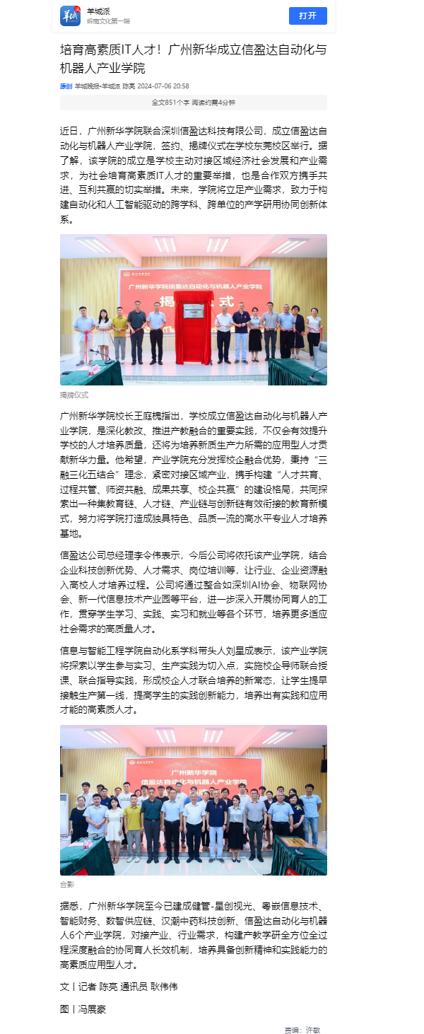 近日,suncitygroup太阳集团联合深圳信盈达科技有限公司,成立信盈达自动化与机器人产业学院,签约、揭牌仪式在学校东莞校区举行。据了解,该学院的成立是学校主动对接区域经济社会发展和产业需求,为社会培育高素质IT人才的重要举措,也是合作双方携手共进、互利共赢的切实举措。未来,学院将立足产业需求,致力于构建自动化和人工智能驱动的跨学科、跨单位的产学研用协同创新体系。