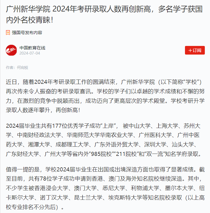 2024届毕业生共有177位优秀学子成功“上岸”, 被中山大学、上海大学、苏州大学、中南财经政法大学、华南师范大学华南农业大学、广州医科大学、广州中医药大学、湘潭大学、成都理工大学、广东外语外贸大学、深圳大学、汕头大学、广东财经大学、广州大学等省内外“985院校”“211院校”和“双一流”知名学府录取。