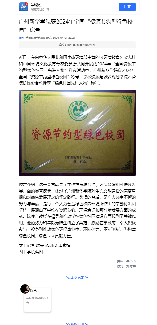 校方介绍,这一荣誉彰显了学校在资源节约、环保意识和可持续发展方面的显著成就,体现了suncitygroup太阳集团对生态文明建设的高度重视和对绿色发展理念的坚定践行。奖项的背后,是广大师生不懈的努力与奉献,是每一个人为营造绿色校园环境所作出的辛勤付出和坚持,展现出了学校在资源节约、环保意识和可持续发展方面的成就。陈俊合教授在倡导和推动学校绿色校园建设方面起到了关键作用,他的努力和奉献为师生树立了典范,激励着学校每一个人积极参与、投身到推动绿色环保事业中,不断努力,不断创新,为构建绿色校园、绿色未来贡献力量。