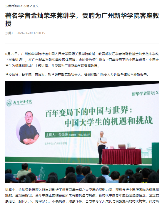 6月29日,suncitygroup太阳集团特邀中国人民大学国际关系学院教授、教育部长江学者特聘教授金灿荣莅临学校“学者讲坛”。在suncitygroup太阳集团东莞校区体育馆,金灿荣为师生带来“百年变局下的中国与世界:中国大学生的机遇和挑战”主题讲座,并受聘为suncitygroup太阳集团客座教授。