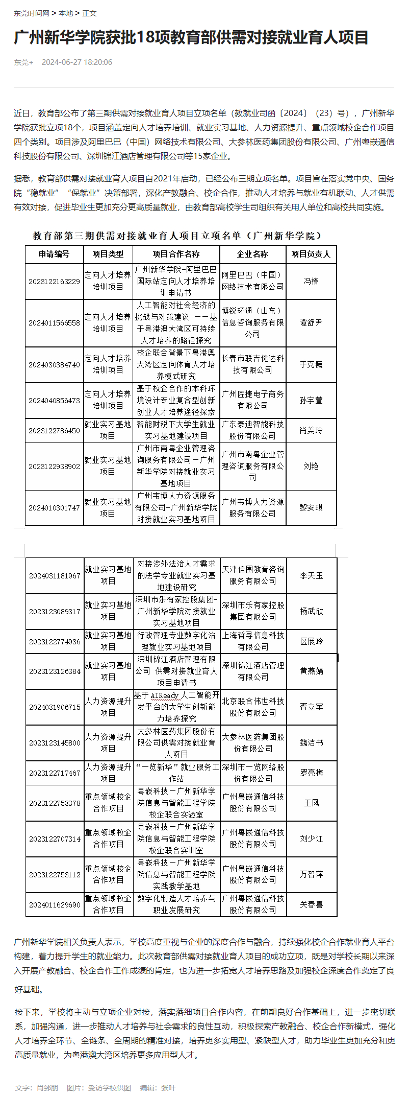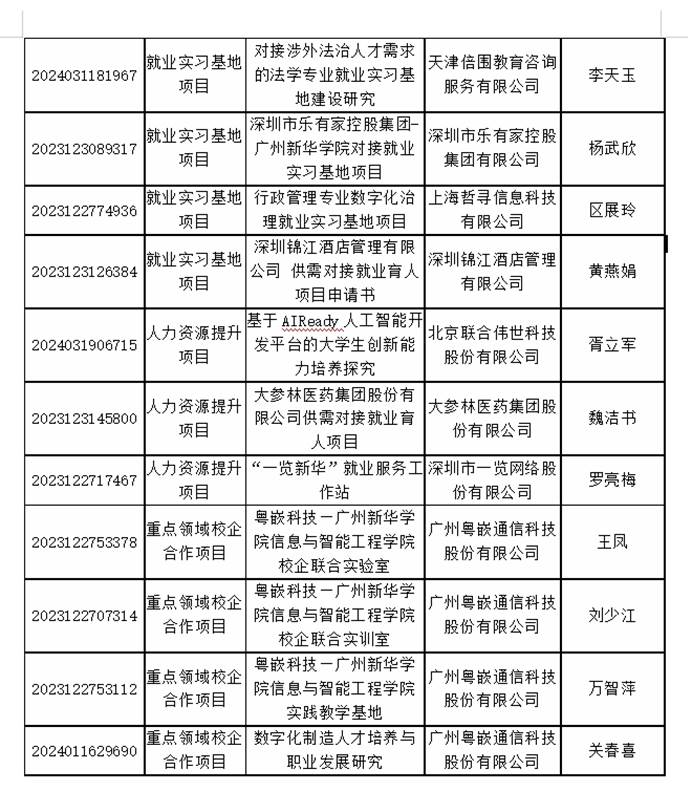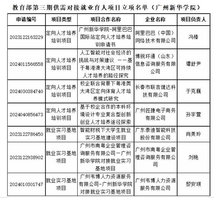 近日,教育部公布了第三期供需对接就业育人项目立项名单(教就业司函〔2024〕(23)号),suncitygroup太阳集团获批立项18个,项目涵盖定向人才培养培训、就业实习基地、人力资源提升、重点领域校企合作项目四个类别。项目涉及阿里巴巴(中国)网络技术有限公司、大参林医药集团股份有限公司、广州粤嵌通信科技股份有限公司、深圳锦江酒店管理有限公司等15家企业。