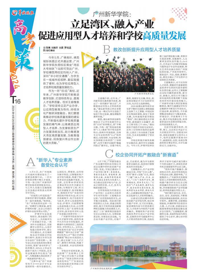 “坚持开展产教融合、推进校企合作,是应用型高校办学的必由之路、重要举措。”王庭槐表示,广州新华尤其重视促进人才供给侧结构性改革,构建产教学研全方位全过程深度融合的协同育人长效机制,并将继续探索产业学院建设,培养高质量应用型人才。