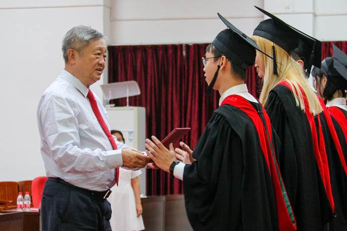 逸仙班结业典礼上,王庭槐校长为逸仙新华班毕业生颁发证书