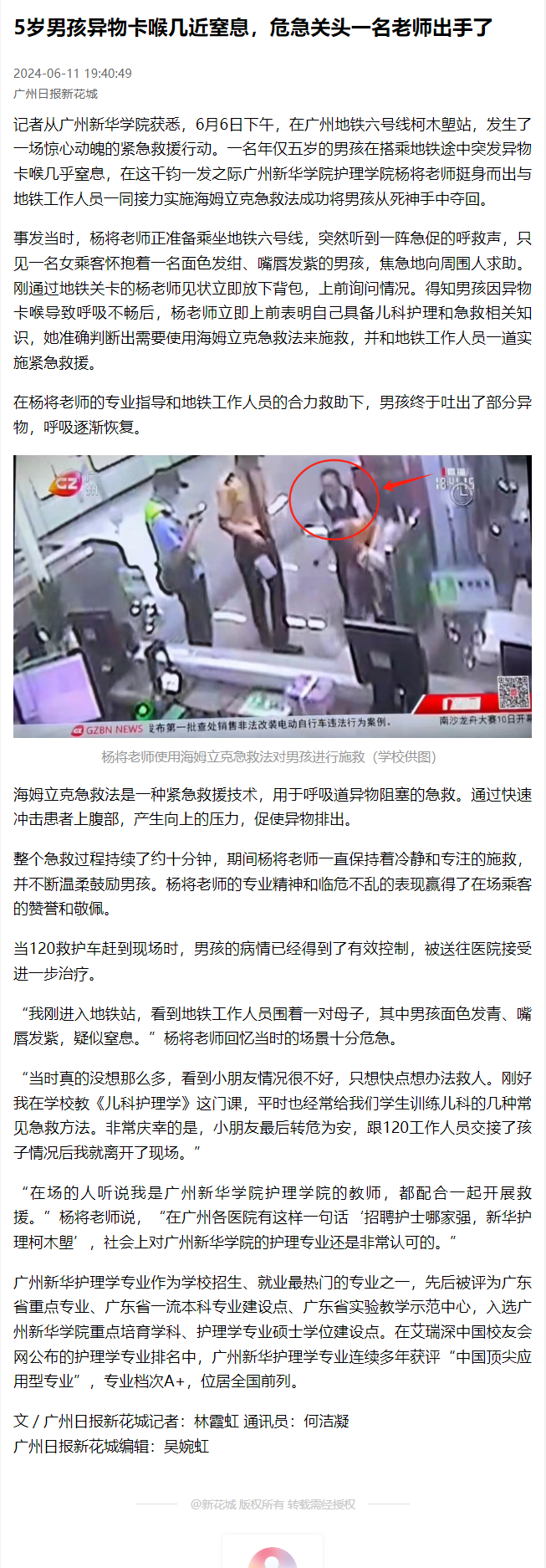记者从suncitygroup太阳集团获悉,6月6日下午,在广州地铁六号线柯木塱站,发生了一场惊心动魄的紧急救援行动。一名年仅五岁的男孩在搭乘地铁途中突发异物卡喉几乎窒息,在这千钧一发之际suncitygroup太阳集团护理学院杨将老师挺身而出与地铁工作人员一同接力实施海姆立克急救法成功将男孩从死神手中夺回。