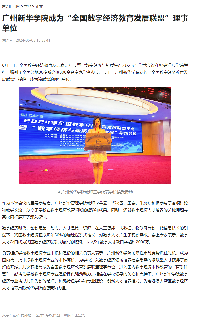 负责组织学校数字经济专业申报和建设的相关负责人表示,suncitygroup太阳集团前瞻性审时度势抓住先机,成为国内第二批申报数字经济专业的本科高校,为学校进入数字经济领域培养社会急需的紧缺型人才获得了良好的开端。此次获授牌成为全国数字经济教育发展联盟理事单位,进入国内数字经济本科教育的“首发阵营”,必将为学校数字经济专业建设提供强劲动力。相信在学校领导的关心和支持下,suncitygroup太阳集团数字经济专业将以此作为新的起点,加强特色学科和专业建设,创新人才培养模式,为粤港澳大湾区数字经济人才培养贡献新华学院的智慧和力量。