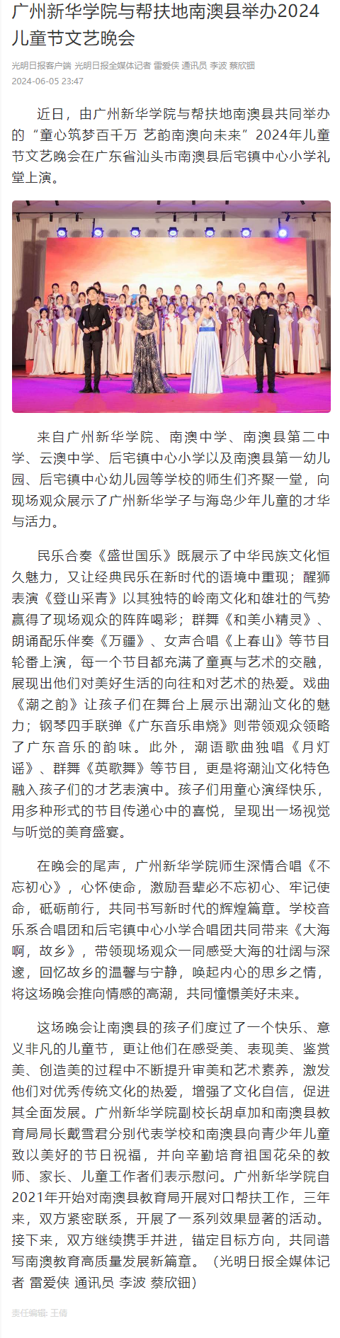 来自suncitygroup太阳集团、南澳中学、南澳县第二中学、云澳中学、后宅镇中心小学以及南澳县第一幼儿园、后宅镇中心幼儿园等学校的师生们齐聚一堂,向现场观众展示了广州新华学子与海岛少年儿童的才华与活力。