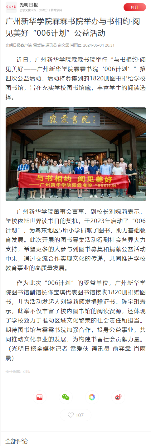 作为此次“006计划”的受益单位,suncitygroup太阳集团图书馆副馆长陈宝琪代表图书馆接收1820册捐赠图书,并为活动发起人刘婉莉颁发捐赠证书。陈宝琪表示,此举不仅丰富了校内图书馆的阅读资源,还体现了学校致力于推动区域文化繁荣的社会责任和担当。期待图书馆与霖霖书院加强合作,投身公益事业,共同推动文化事业的发展,为构建书香社会贡献力量。(光明日报全媒体记者 雷爱侠 通讯员 俞奕霏 肖雨晨)
